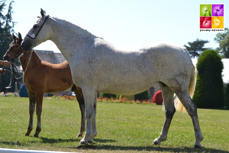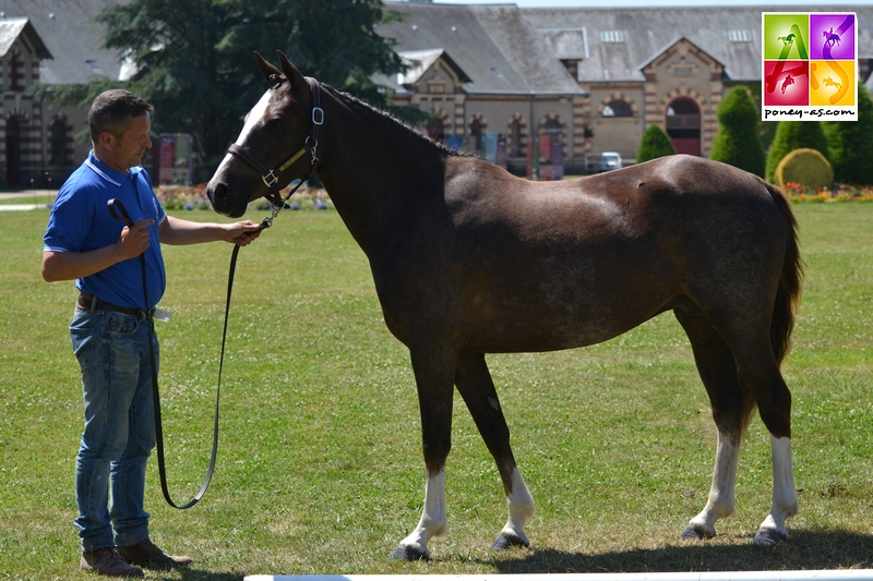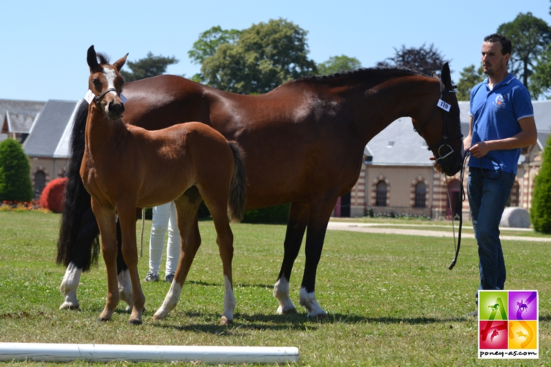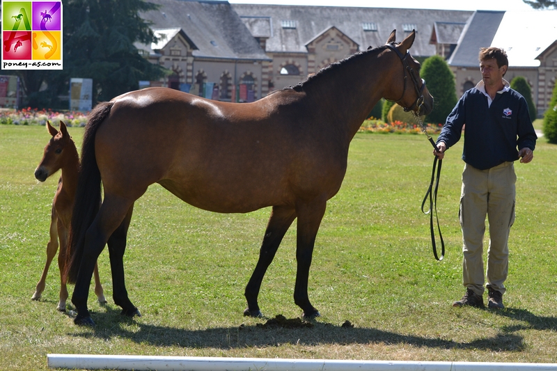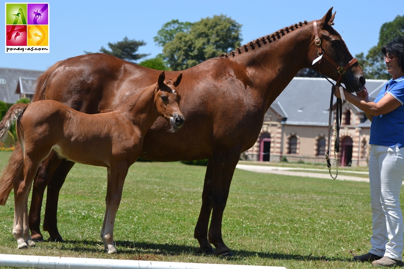 Elle n’en est pas à sa première victoire, « je ne sais plus très bien, peut être à-t-elle gagné 6 ou 7 fois ce local ! », confiait son propriétaire Ludovic Burnouf. Et 2017 n’a pas fait exception à la règle : Molene des Verrouis (Pfs, par Titan du Mougard et Idole de la Peignie par Cyrano Pondi, Co), née chez Madame et Monsieur Saintange à Lingreville dans la Manche a été élue meilleure poulinière à Saint-Lô après avoir terminé l’an passé vice-championne de France au Sologn’Pony ! Agée de 17 ans (et les plus âgées se sont souvent montrées à leur avantage, bien conservées et présentées), le beau moule alezan brulé a décroché la note de 16,20/20 ! « Je suis fière de ma jument, son fils Voltair de Lalande (IPC 156/15) est potentiellement sélectionnable pour les championnats d’Europe de CCE et Coutsou (première génération vue à Saint-Lô), propre frère de Voltair, avait été 3e de la finale des mâles Pfs de 3 ans ». Sortie en Cycle Classique à 4 ans, Coutsou avait une femelle d’1 an présentée à ce local, G Rever d’Ymou. Les tous jeunes produits de Molène étaient aussi présents la veille : Etoile (6e des femelles de 3 ans) et Fantastic (11e des mâles de 2 ans). Sa mère, Idole de Peignie, sortie en compétition, a produit Un Amour Hautecour (Excellent en CCJP de CSO à 5 ans). « Elle a un bon foal, alors Molène sera de nouveau présente au Sologn’Pony ».