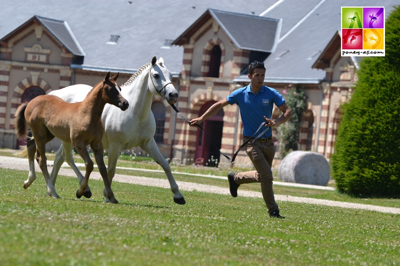 En ce qui concerne la classe des mâles (13 inscrits), c’est le poulain de Champagne d’Ar Cus et de Ready Steadygo Clover qui s’impose (51/60, soit la meilleure note des poulains examinés sur la journée). Très plaisant et expressif Hendrix Bret’L est le premier poulain d’Adrien Bret dont l’élevage est situé à Couvains : « Ready me plaisait beaucoup et j’ai demandé à Ludovic Burnouf, son propriétaire, si je pouvais la louer pour une saison. J’ai choisi Champagne car je me suis occupé de lui lorsqu’il était au prélèvement au Haras de Saint-Lô. C’est assez incroyable de gagner ici avec son premier poulain ! », lançait le jeune homme, collaborateur de Denis Hubert, étalonnier et inséminateur à France Etalons. Avec Charles Grass, naisseur et propriétaire de la championne des 1 an Gamble Star Cameo, il s’associe dans un projet de « fabrication » d’un poulain en commun (jument de selle en attente de DG de Balou Star). Chouette week-end pour tous les deux !