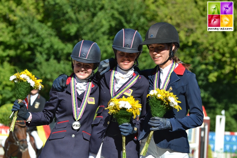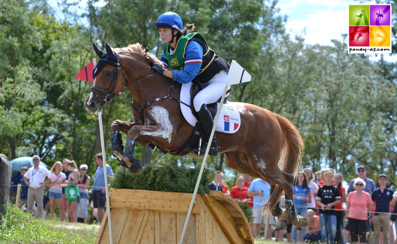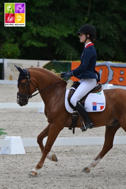 « J’étais plutôt sereine car après deux mois passés en stage chez ma coach Sophie Lemoine, mon poney était au top de sa forme. Nous l’avions bien préparé physiquement, d’abord pour les championnats de France puis dans la continuité pour les Europes et durant le stage avec l’équipe à Fontainebleau. De mon côté, Sophie m’a beaucoup aidé mentalement pour me concentrer uniquement sur mon épreuve et me mettre à fond dedans. Elle m’a aussi permis de monter beaucoup d’autres chevaux différents et donc de parfaire ma technique. J’ai eu de très bonnes sensations avec Voltair sur le carré, en particulier au trot. Le travail au galop était moins brillant que d’habitude dû sûrement à une fin de paddock compliquée, je suis donc moins allée chercher les points. On finit deuxième de ce test, c’était incroyable. Sur le cross, Voltair a été très franc plutôt dans le galop. C’était un de nos meilleurs cross, très agréable à monter mais technique avec pas mal de question à se poser ! Emmanuel Quittet notre sélectionneur avait fais le choix judicieux de l’option longue sur le 15A pour assurer le sans-faute. Sur le cross, pour moi la difficulté principale était le chrono et comme pour tous je pense, le contre bas 14 suivit de la combinaison de triple brush 15 AB. Voltair a très bien récupéré du cross et a vraiment bien sauté au CSO. Une grosse incompréhension nous vaut une barre. Je redoutais la ligne spa vertical (celle où je faute d’ailleurs…) sinon le tour était plutôt classique. Nous finissons notre tour à 4 points, un peu déçue mais vite remise en apprenant que l’on serait quoi qu’il arrive champions d’Europe par équipes et que l’on décrochait la médaille de bronze au classement individuel ! C’était incroyable d’être dans la même épreuve que tous les meilleurs cavaliers poney européens, on avait déjà rencontré l’équipe allemande à Marbach en mai, mais pas les anglais ni les irlandais. Ces derniers sont vraiment bon au cross et vraiment sympa !