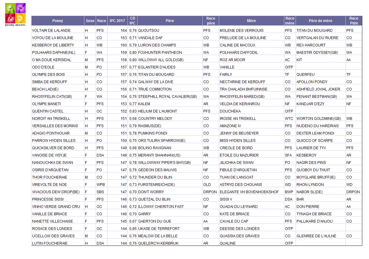Outre Voltair, les poneys de l’équipe de France médaillé d’or en Hongrie, O Ma Doué Kersidal, Olympe des Bois et Perle du Boisdelanoue, obtiennent les indices respectifs de 158, 157 et 140.