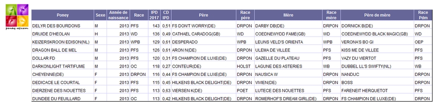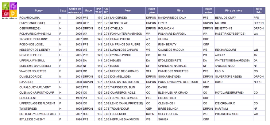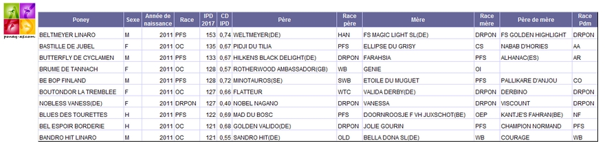 Du côté des poneys de 7 ans et plus, la palme revient à Romario Luna (Pfs, par Lancer, Drp et Mandarine de Caux par Beril de Civry), gratifié d’un IPD de 170. Ce bai est né chez Isabelle Arnaud Stouff (72) et a évolué cette saison jusqu’en Grand Prix (7e du championnat As Elite avec Lola Tardieu). L’Allemande Fairy Dance S (par Kennedy et Flyer par No Limit), née chez Anja Stoffers, est auréolée d’un IPD de 152 grâce à des victoires en As Poney 1.