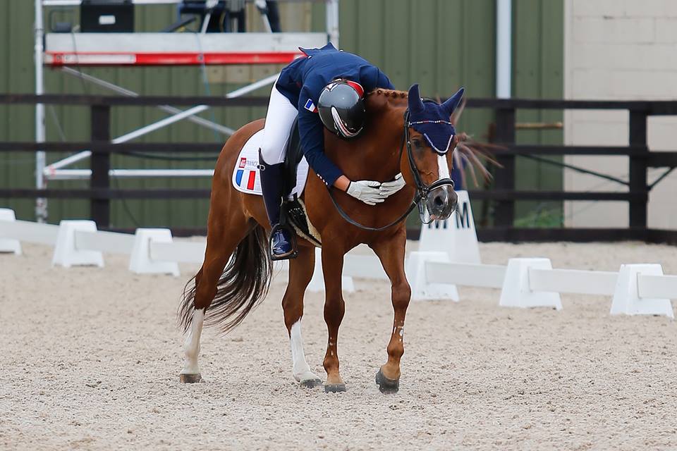 L’équipe de France termine donc 8e sur 13 de ces championnats. Une place que l’on ne retiendra pas à contrario du score : 206.685 points soit 68,89 %. Jamais les Bleuets n’avaient obtenu cette moyenne jusque là, pas même lorsqu’ils s’étaient classés 5e à Arezzo en 2013, notés à 204 points. Viennent donc compléter les scores de 67,971% et 67,771% d’Alexandre Cheret (Butterfly Dew Drop) et Lou Morali (Swyn Barrade) : Jade Leborgne (Beltmeyer Linaro) à 68.971 % et Aurore Thévenot (Osbourne) à 69.743 %. Pour Muriel Léonardi, la chef d’équipe, satisfaite des prestations de sa petite troupe : « l’objectif est atteint. Jade a déroulé une belle reprise avec son poney âgé seulement de 7 ans. Une petite défense et une faute dans le reculé l’ont pénalisé, mais le poney est prometteur ; nous devrions le revoir avec l’une des petites sœurs de Jade. Quant à Aurore, elle a déroulé une reprise technique sans faute et frôle le 70% avec Osbourne pour sa dernière participation aux championnats d’Europe ».