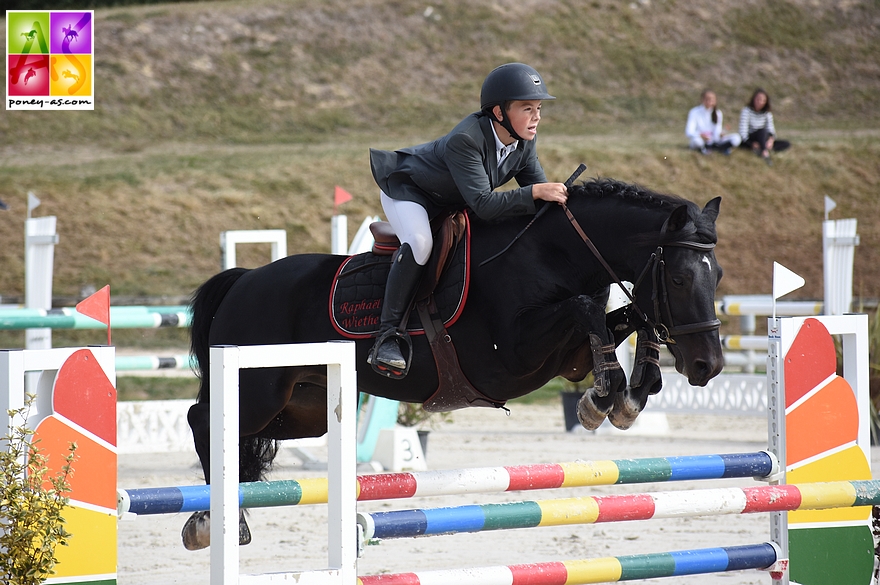 Contrairement à la veille, le paddock du dimanche était en manège. Le fait de sortir de l’ombre et d’aller sauter sur la grande piste extérieure a peut être surpris certains poneys. Toujours est-il que le New Forest Lovelyhill Magical Height n’a lui pas été perturbé. Avec Raphaël Wiethe, le placide étalon noir s’est de nouveau imposé dans l’As Poney 1 en réalisant le seul double sans-faute ! Titouan Marilley sur Viking Melody (0+8) et Lou, associée cette fois à Carlito de Méla (0+abandon) sont respectivement 2e et 3e.