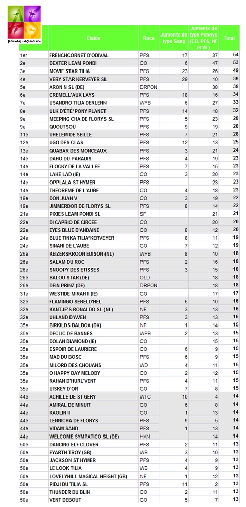 Seize étalons Connemara trustent ce palmarès dont Dexter Leam Pondi, Théoreme de l’Aube et Lake Lad (23 juments saillies). Sept appartiennent au stud-book du poney Welsh (3 Part-Bred, 2 de section B, 1 Cob et 1 Wtc) à l’instar d’Usandro Tilia Derlenn (33 juments), du Néerlandais Keizerskroon Edison et du performer en Grand Prix de CSO Milord des Chouans (15 juments). Trois sont de race New Forest, tous nés à l’étranger : le très grand sire européen Kantje’s Ronaldo SL (Pays-Bas), le Danois Birkilds Balboa et le Britannique Lovelyhill Magical Height.