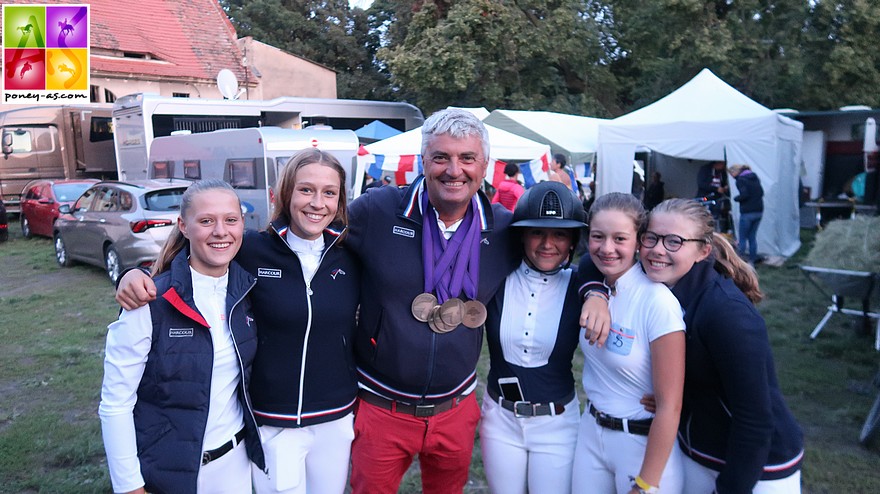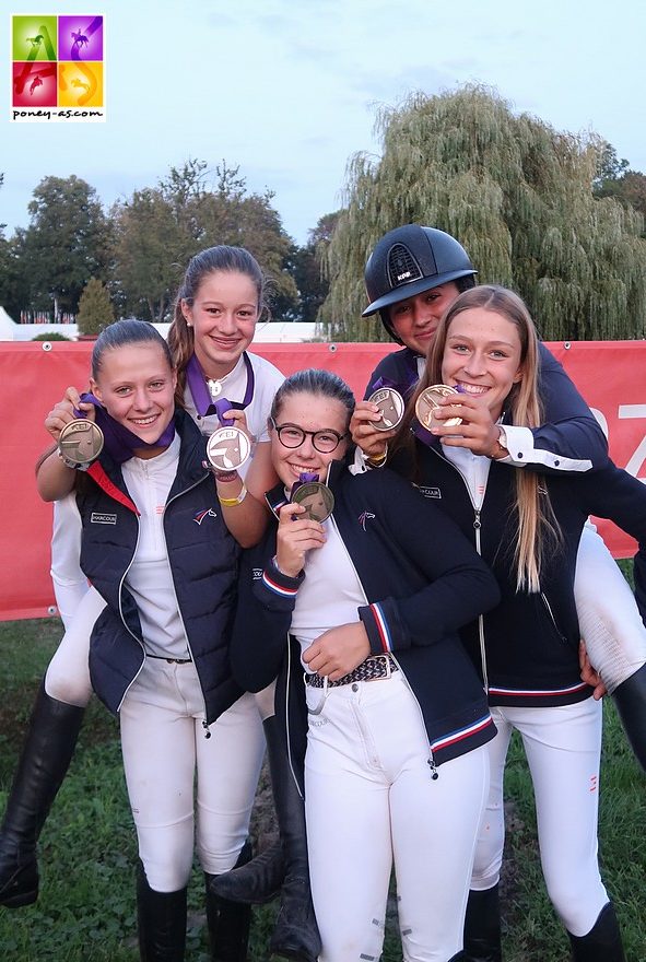 France / Allemagne. Qui allait sortir de ce duel ? Jeanne et Armene ont tout de suite donné le ton et ont sortis un parcours à 0, plus rapide que celui de Bo Chiara Gröning et Chessy 18. Ilona et Callas ont fauté par une fois, mais Magnus Schmidt et son excellente An Angel aussi… Pauline et Sligo ont écopé d’un refus : 7 points, mais Luzie Jüttner et Orchid’s Arissia ont commis 2 fautes… Tout reposait sur les épaules de Romane et Quabar. La paire n’a pas trainée, bien que moins rapide que Johanna Beckmann et Karim van Orchid’s. Au cumul, la France bat la Mannschaft et décroche sa médaille tant attendue ! « Peu importe la couleur, l’objectif était de ramener une médaille. Celle-ci représente beaucoup de travail tout au long de la saison et c’est une juste récompense pour les enfants et les coachs. Une médaille est très difficile à obtenir, alors même si nous rêvions de l’or tout à l’heure, nous devons la savourer ! », lançait Olivier Bost. Entre larmes de joie et rire, les tricolores l’ont savourée sur le podium, puis à leur camion, après le debrief de leur sélectionneur. Notre cavalière individuelle Emma Méric sort quant à elle avec 4 points sur chacune de ses manches avec sa Venise des Islots.